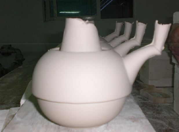wozu eine Porzellanmasse (Schlicker) verwendet wird, die durch Zusatz von Verflüssigungsmitteln wie Soda gießfähig gemacht wurde.