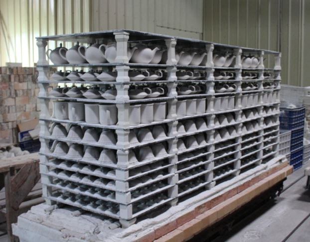 Nach dem Vortrocknen wird das Porzellan bei ca. 1000 °C zum ersten Mal gebrannt, wodurch es nicht mehr wasserlöslich, jedoch porös und wasseraufnahmefähig ist.