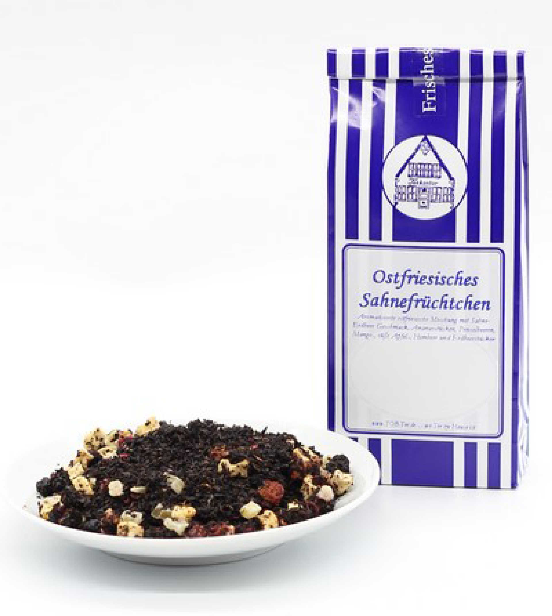 Aromatisierte ostfriesische Mischung mit Sahne-Erdbeer Geschmack, Ananasstücken, Preiselbeeren, Mango-, süße Apfel-, Himbeer und Erdbeerstücken