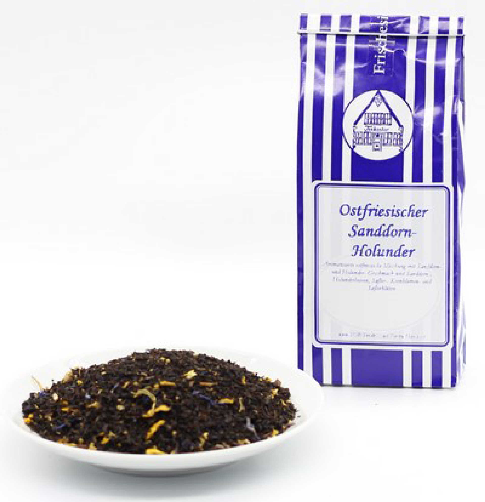 Aromatisierte ostfriesische Mischung mit Sanddorn- und Holunder- Geschmack und Sanddorn-, Holunderbeeren, Saflor-, Kornblumen- und Saflorblüten