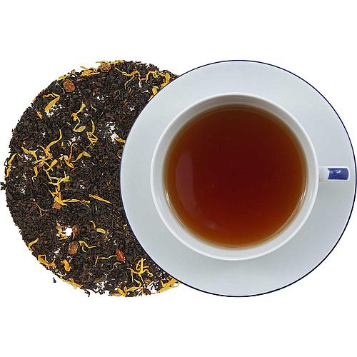 Aromatisierte ostfriesische Mischung mit Sanddorn- und Holunder- Geschmack und Sanddorn-, Holunderbeeren, Saflor-, Kornblumen- und Saflorblüten