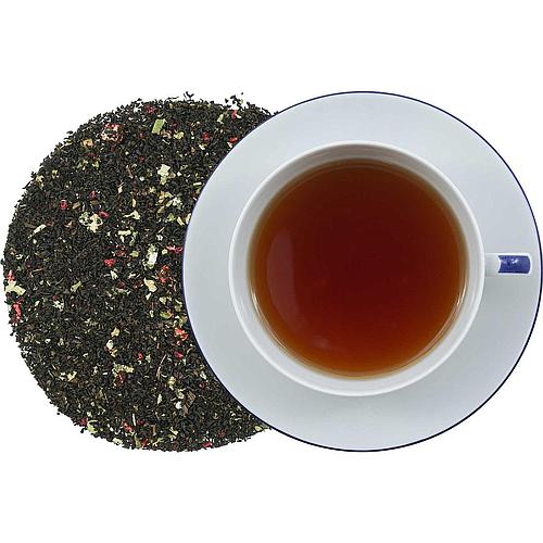 Aromatisierte ostfriesische Mischung mit fruchtigem Beeren-Geschmack. Zutaten: Schwarzer Tee, Erdbeerblätter, Aroma, Himbeerstücke, Rhabarberstücke.