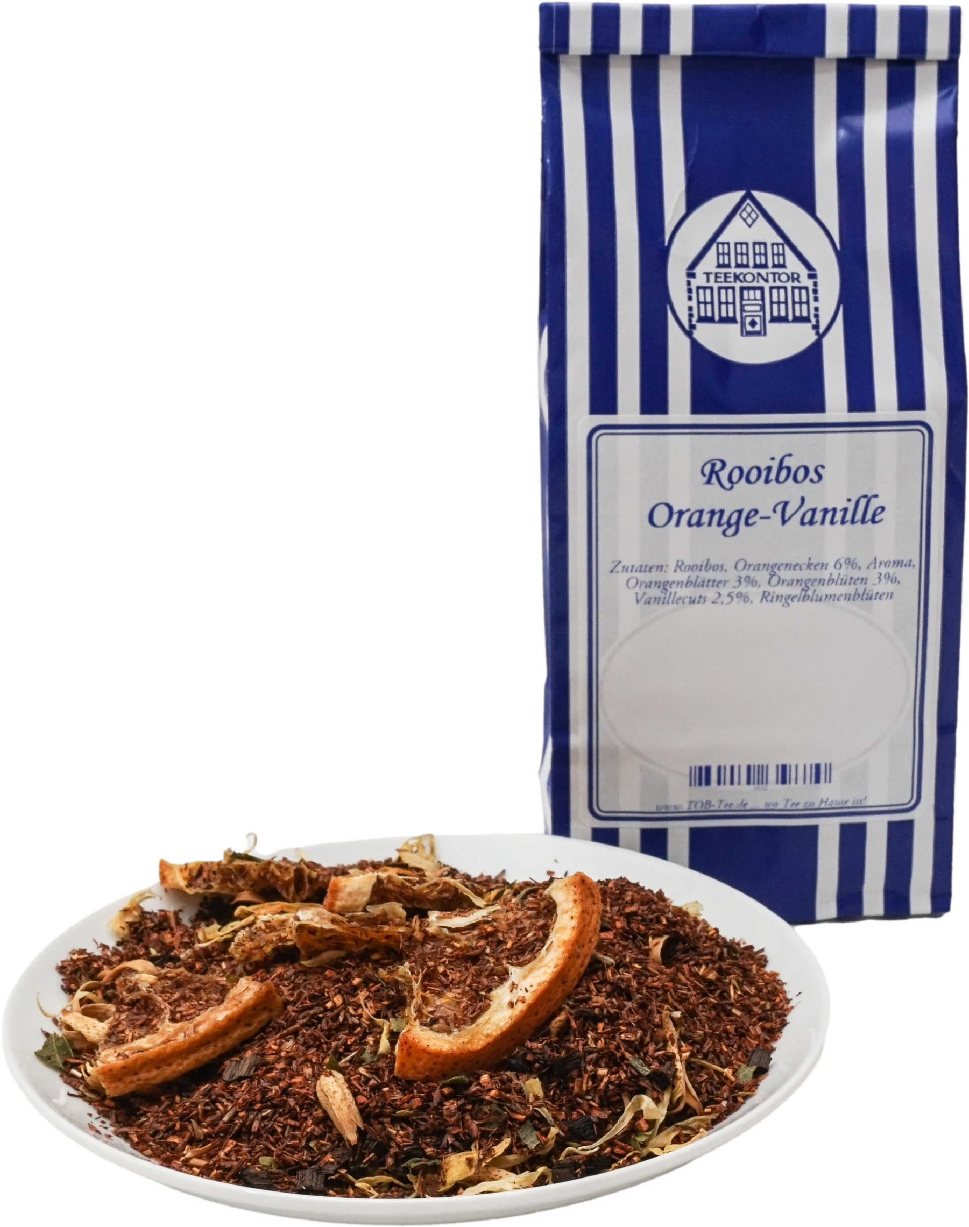 Zutaten: Rooibos, Orangenecken 6%, Aroma, Orangenblätter 3%, Orangenblüten 3%, Vanillecuts 2,5%, Ringelblumenblüten