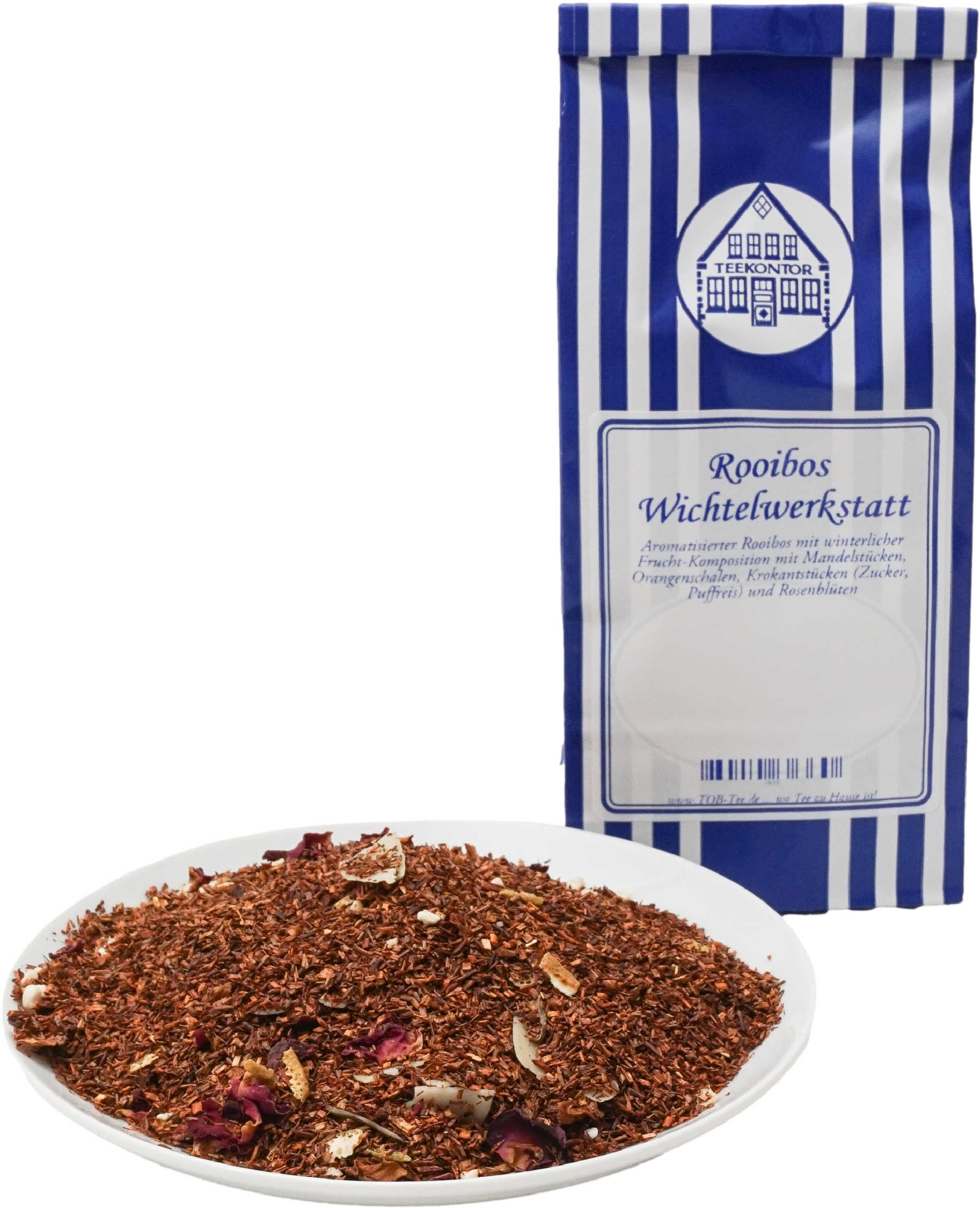 Aromatisierter Rooibos mit winterlicher Frucht-Komposition mit Mandelstücken, Orangenschalen, Krokantstücken (Zucker, Puffreis) und Rosenblüten