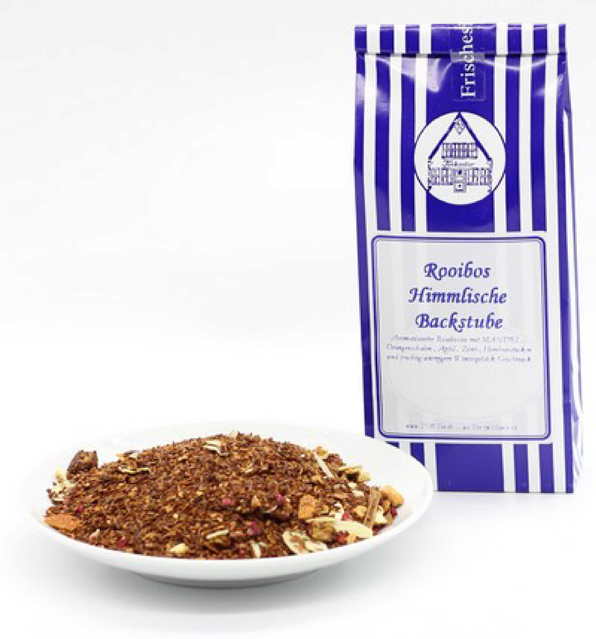 Aromatisierter Rooibostee mit MANDEL-, Orangenschalen-, Apfel-, Zimt-, Himbeerstücken und fruchtig-würzigem Wintergebäck-Geschmack