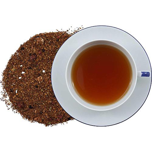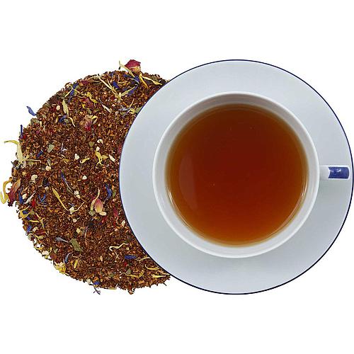 Aromatisierter Rooibos mit Fruchtmix-Geschmack und Papayastücken (Papaya, Zucker), Orangenecken, Lemongras, roten Johannisbeeren, Rotsandelholz, Kornblumenblüten und Katzenpfötchen