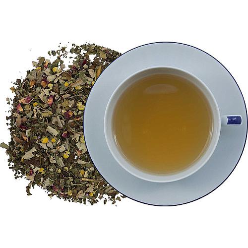 Zutaten: Sanddornbeeren geschnitten 65%, Brombeerblätter, Pfefferminze, Sanddornblätter 10%, Sanddornbeeren 5%, Melisse, Kamillenblüten, Rosen-, Heide-, Lavendelblüten