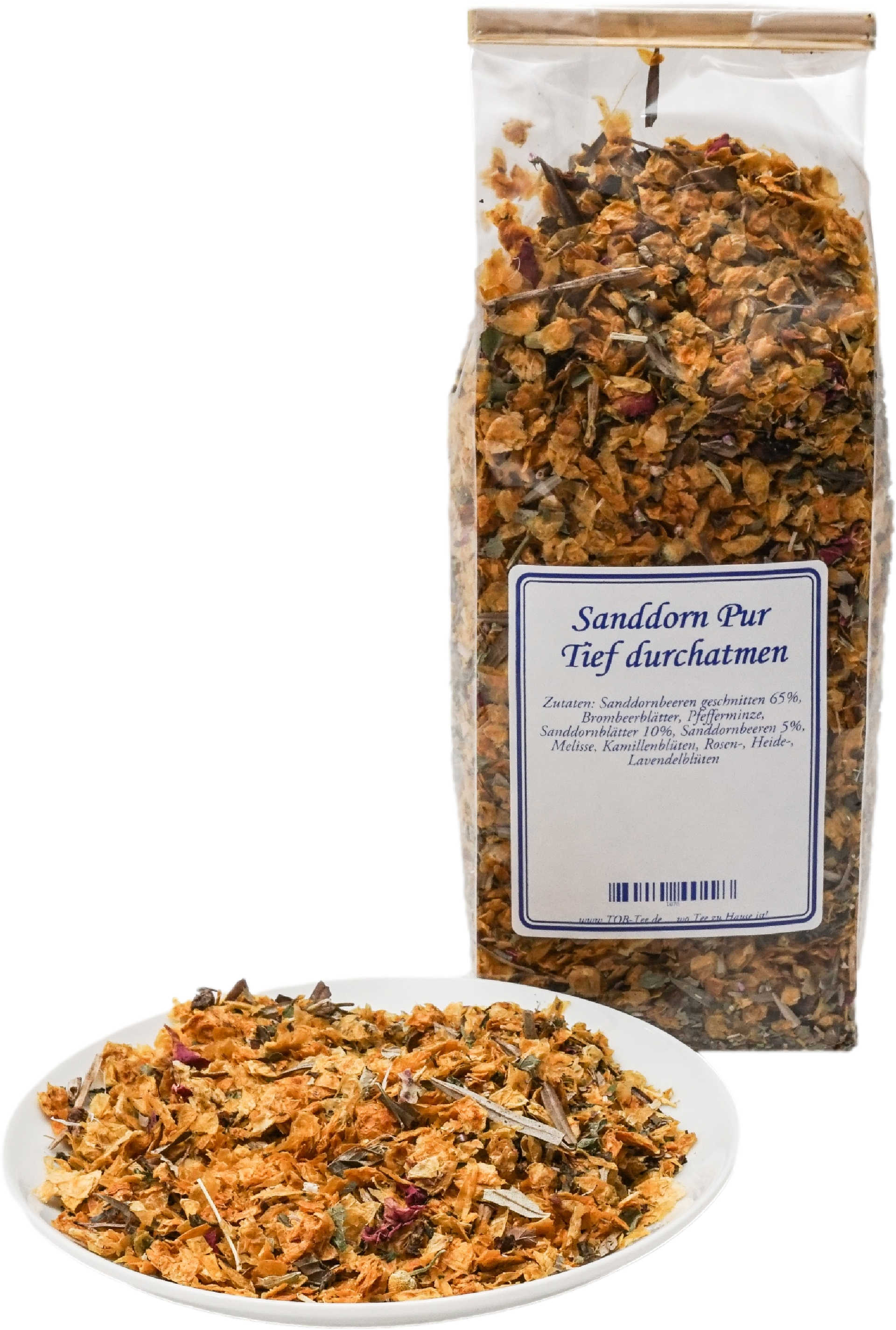 Zutaten: Sanddornbeeren geschnitten 65%, Brombeerblätter, Pfefferminze, Sanddornblätter 10%, Sanddornbeeren 5%, Melisse, Kamillenblüten, Rosen-, Heide-, Lavendelblüten