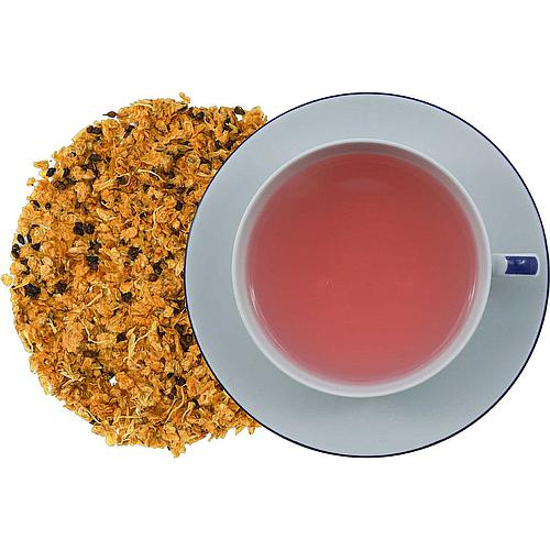 Aromatisierter Sanddornbeerentee mit geschnittenen Sanddornbeeren, Holunderbeeren, und Sonnenblumenblütenblättern
