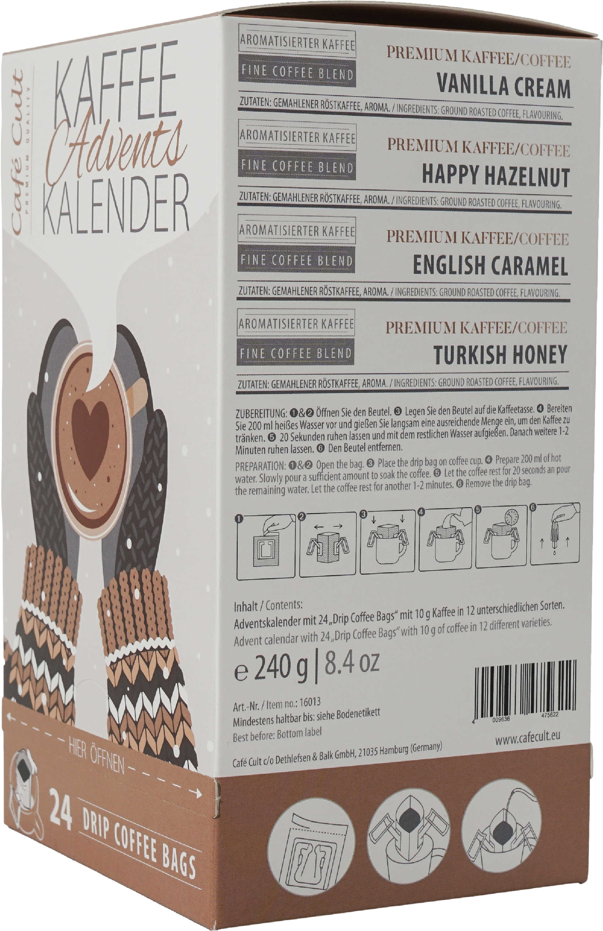 Kaffee-Adventskalender „Handwärmer“ mit 24 Drip Coffee Bags einzeln im Sachet verpackt Format 124 x 100 x 200 mm -2-sprachig