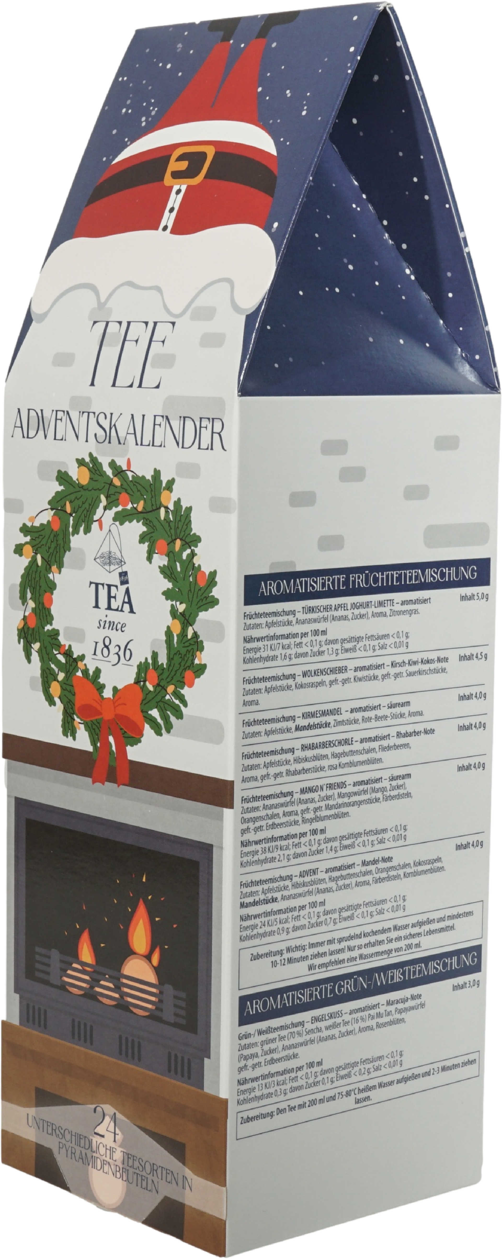 Tee-Adventskalender „Kamin Hygge“ mit 24 Pyramidenbeuteln einzeln im Sachet verpackt Format 92 x 92 x 305 mm