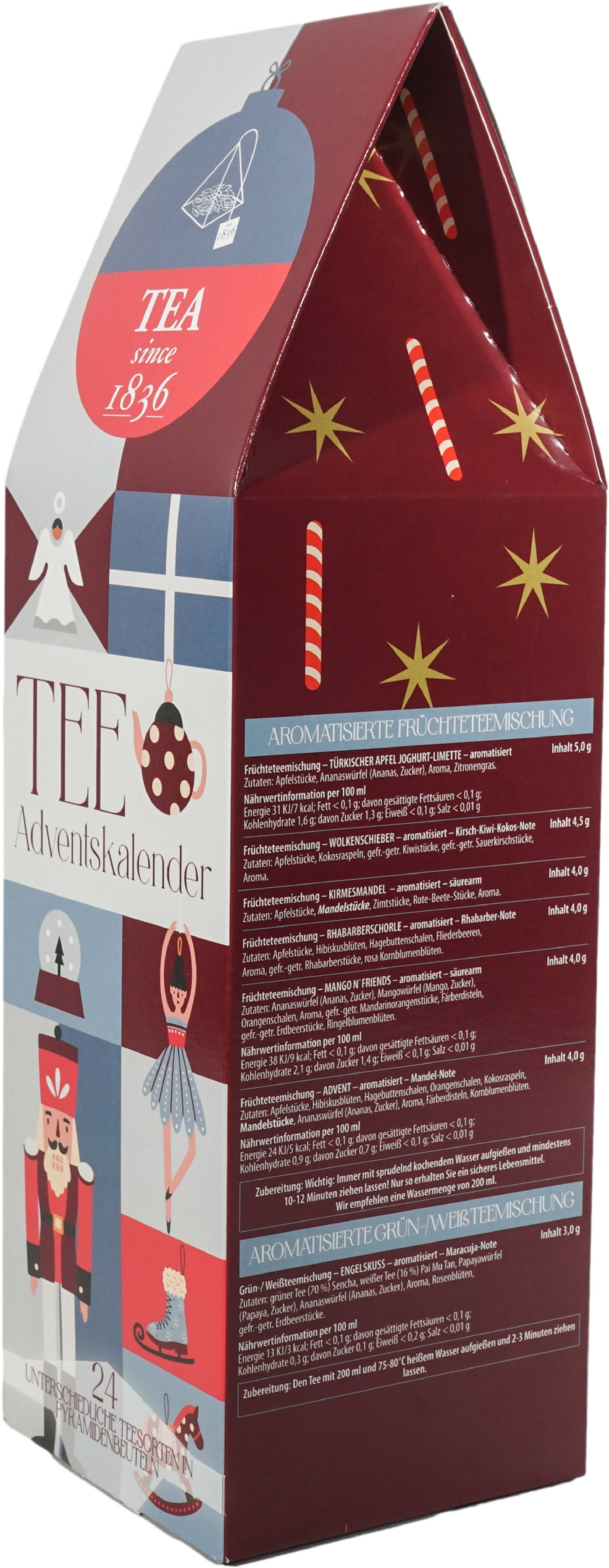 Tee-Adventskalender „Nussknacker rot“ mit 24 Pyramidenbeuteln einzeln im Sachet verpackt Format 92 x 92 x 305 mm
