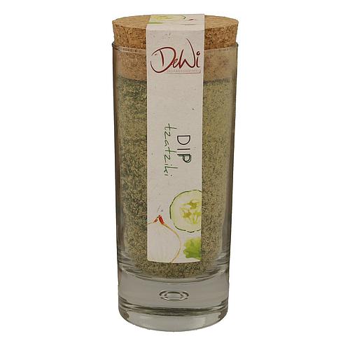 Gewürzzubereitung mit Knoblauch, Zwiebeln, Meersalz, Schnittlauch, Pfeffer, Dillspitzen, Zitronenschalen, Petersilie, Ingwer, Oregano, Basilikum. Zubereitung: 1 gr. Zwiebel und 1 kl. Gurke fein hacken, 2 EL Olivenöl mit 3-4 EL Tzatziki Dip in 500 g Quark und 200 g Créme frâiche verrühren