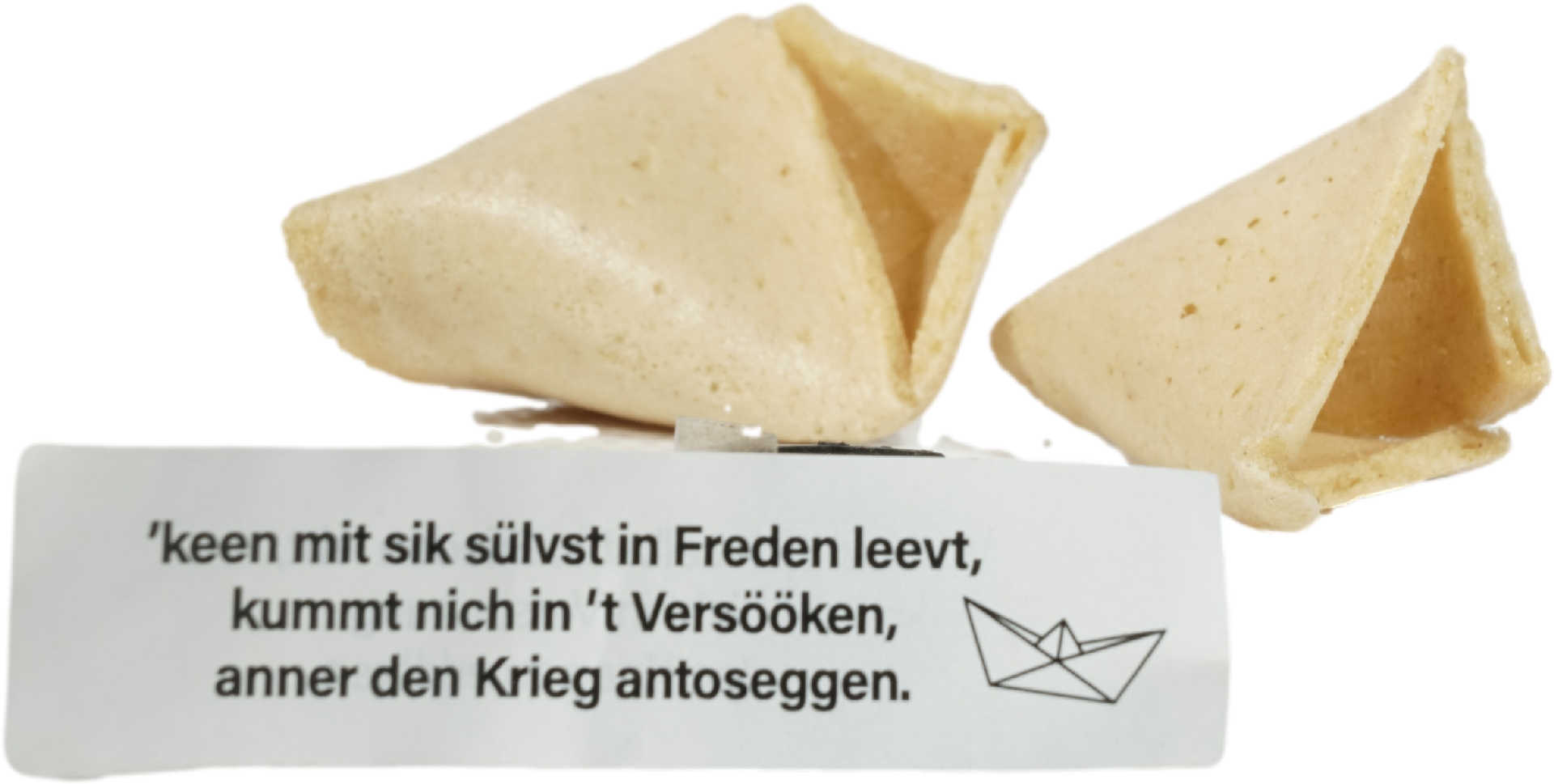 Diese Glückskekse in zwei typisch regionalen Geschmacksrichtungen „Rullerke“ (Neujahrskuchengebäck mit Anis und Kardamom) und BIO Sanddorn sind mit über 200 Lebensweisheiten auf Plattdeutsch mit hochdeutscher Übersetzung befüllt. Die plattdeutsche Schreibweise orientiert sich dabei an dem überregionalen SASS Wörterbuch, um in allen plattdeutschen Regionen verstanden zu werden.