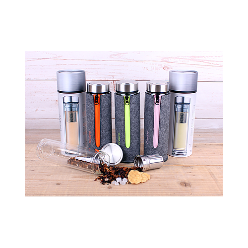 Der Thermo Teamaker kommt in einer Doppelwandverglasung aus Borosilikatglas, integriertem Edelstahlfilter und stylischer Filztasche.