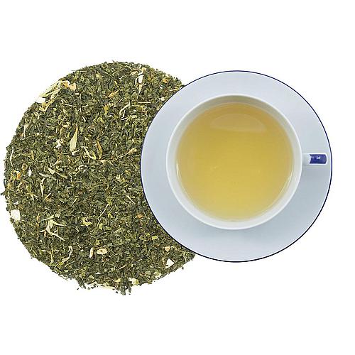 Grüner Tee, Zitronenschale, Orangenecken, Erdbeerstücke, natürliches Aroma, Ringelblumenblüten.