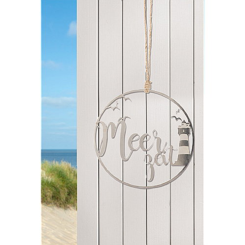 Kreis "Meerzeit" silberfarben, mit Möwe auf Base aus Mangoholz