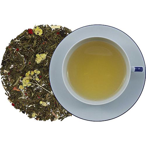NICHT aromatisierter grüner Tee, Ingwerstücke, Zitronenflocken (Zitronensaftkonzentrat, Maisstärke), Zitronenschalen, Lemongras, Ringelblumenblüten