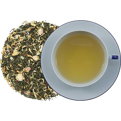 Natürlich aromatisierter grüner Tee mit lieblicher Pfirsich-Limetten-Komposition. Zutaten: Grüner Tee, Pfirsichstücke (Pfirsich, Trennmittel: Reismehl), Pomeranzenschalen, natürliches Aroma, Eibischblüten, Ringelblumenblüten.