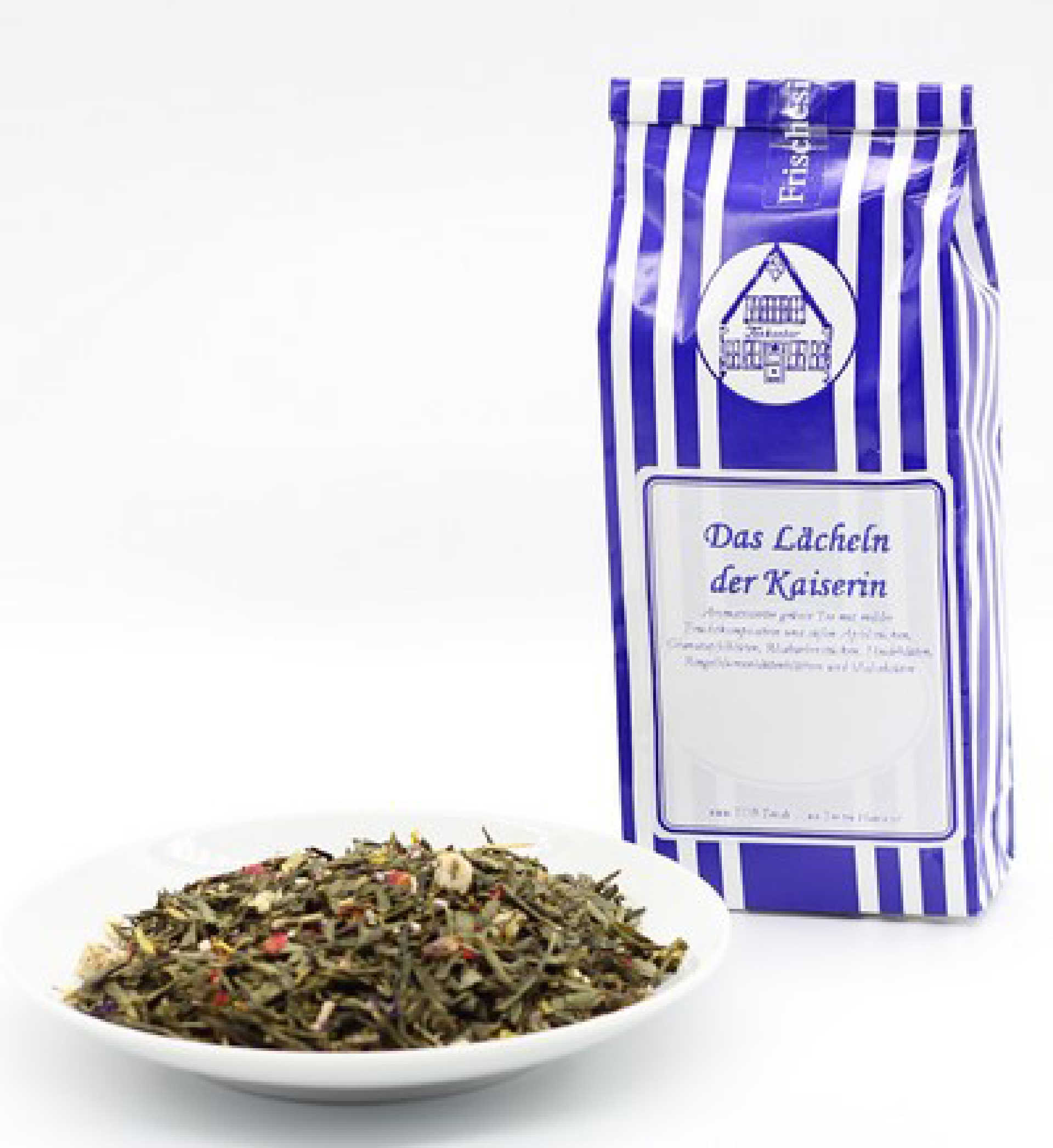 Grüntee mit Apfel, Rhabarber & Blüten – zart, edel und königlich.