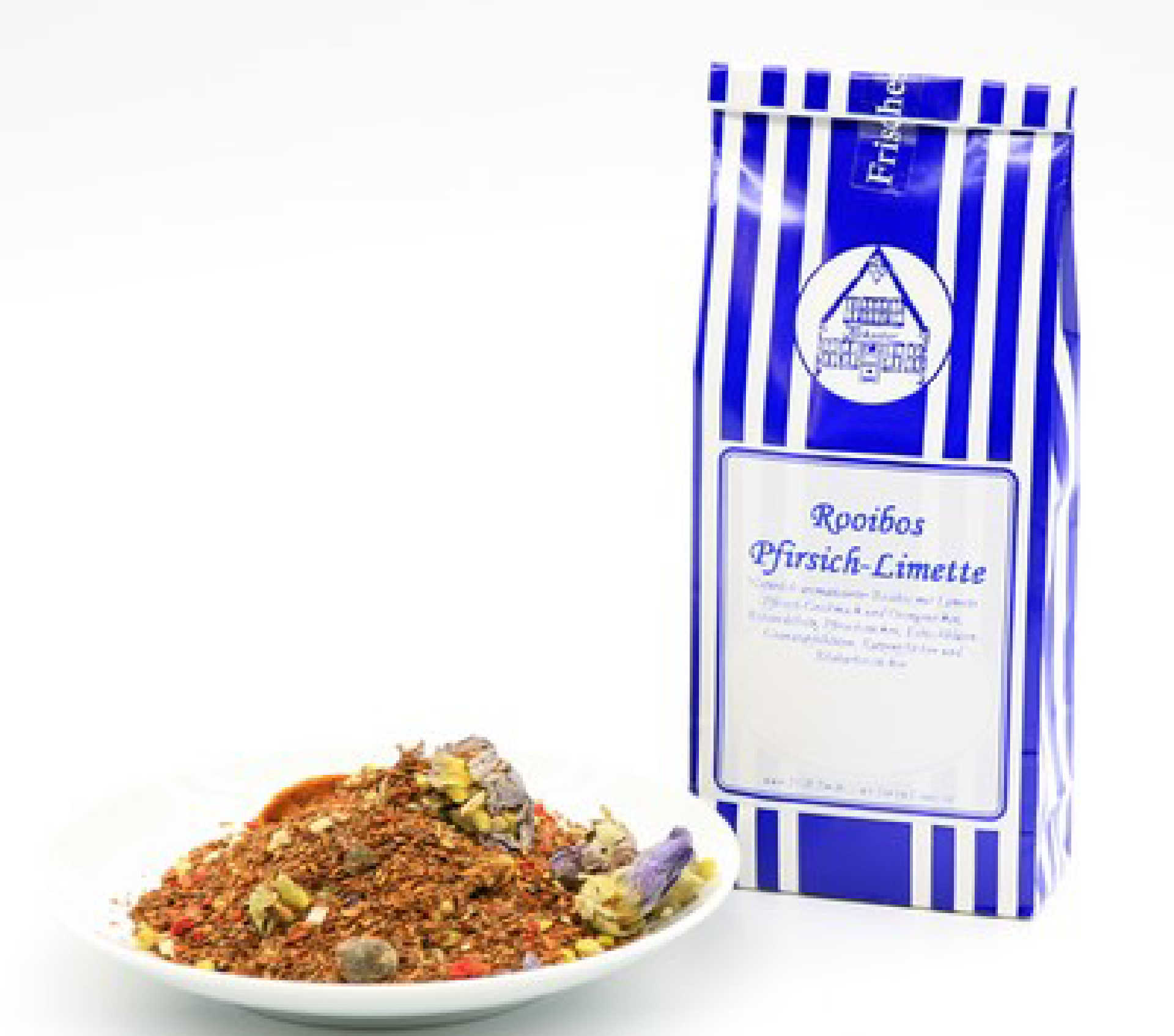 Natürlich aromatisierter Rooibos mit Limette-Pfirsich-Geschmack und Orangenecken, Rotsandelholz, Pfirsichstücken, Eibischblüten, Granatapfelblüten, Katzenpfötchen und Rhabarberstücken