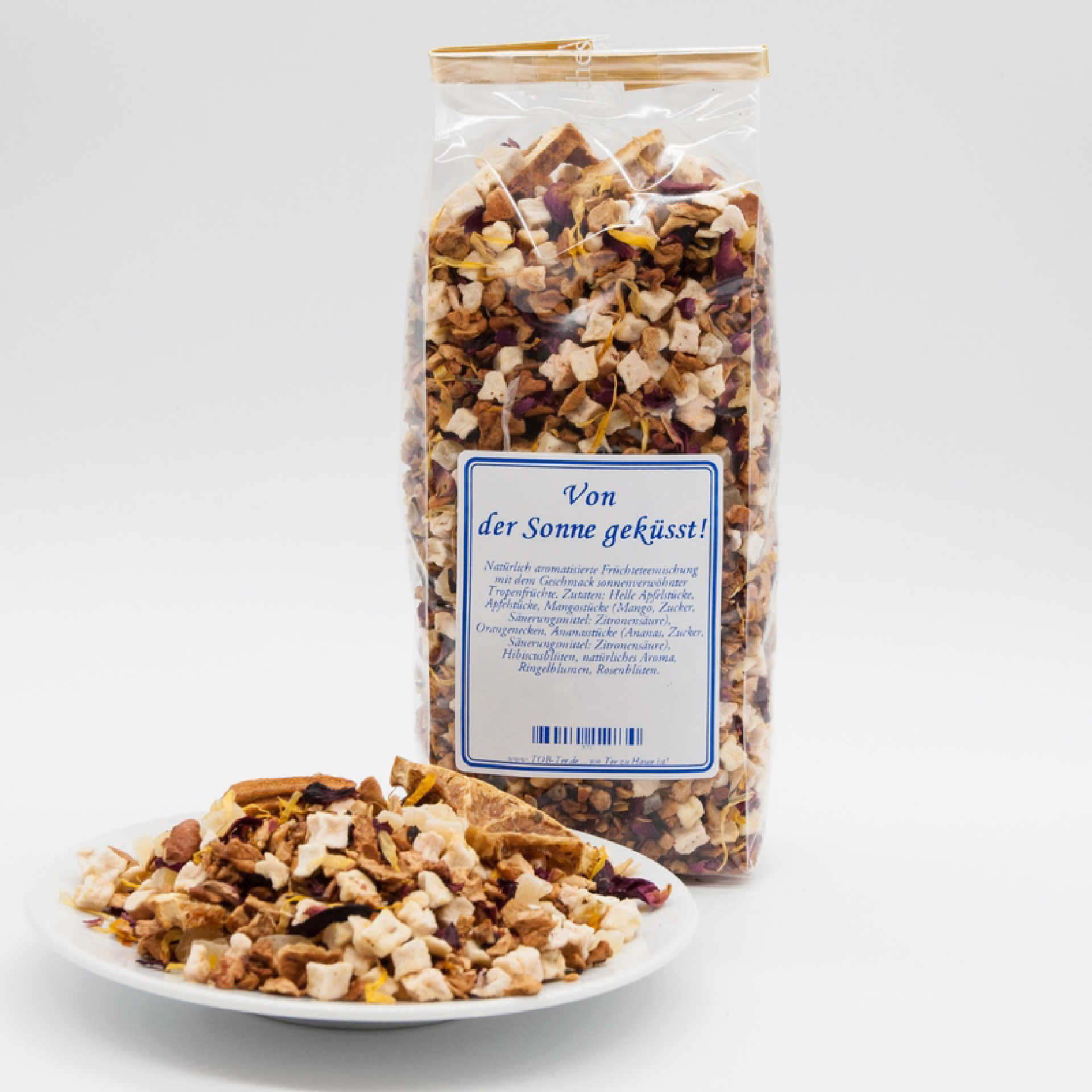 Natürlich aromatisierte Früchteteemischung mit dem Geschmack sonnenverwöhnter Tropenfrüchte. Zutaten: Helle Apfelstücke, Apfelstücke, Mangostücke (Mango, Zucker, Säuerungsmittel: Zitronensäure), Orangenecken, Ananasstücke (Ananas, Zucker, Säuerungsmittel: Zitronensäure), Hibiscusblüten, natürliches Aroma, Ringelblumen, Rosenblüten.