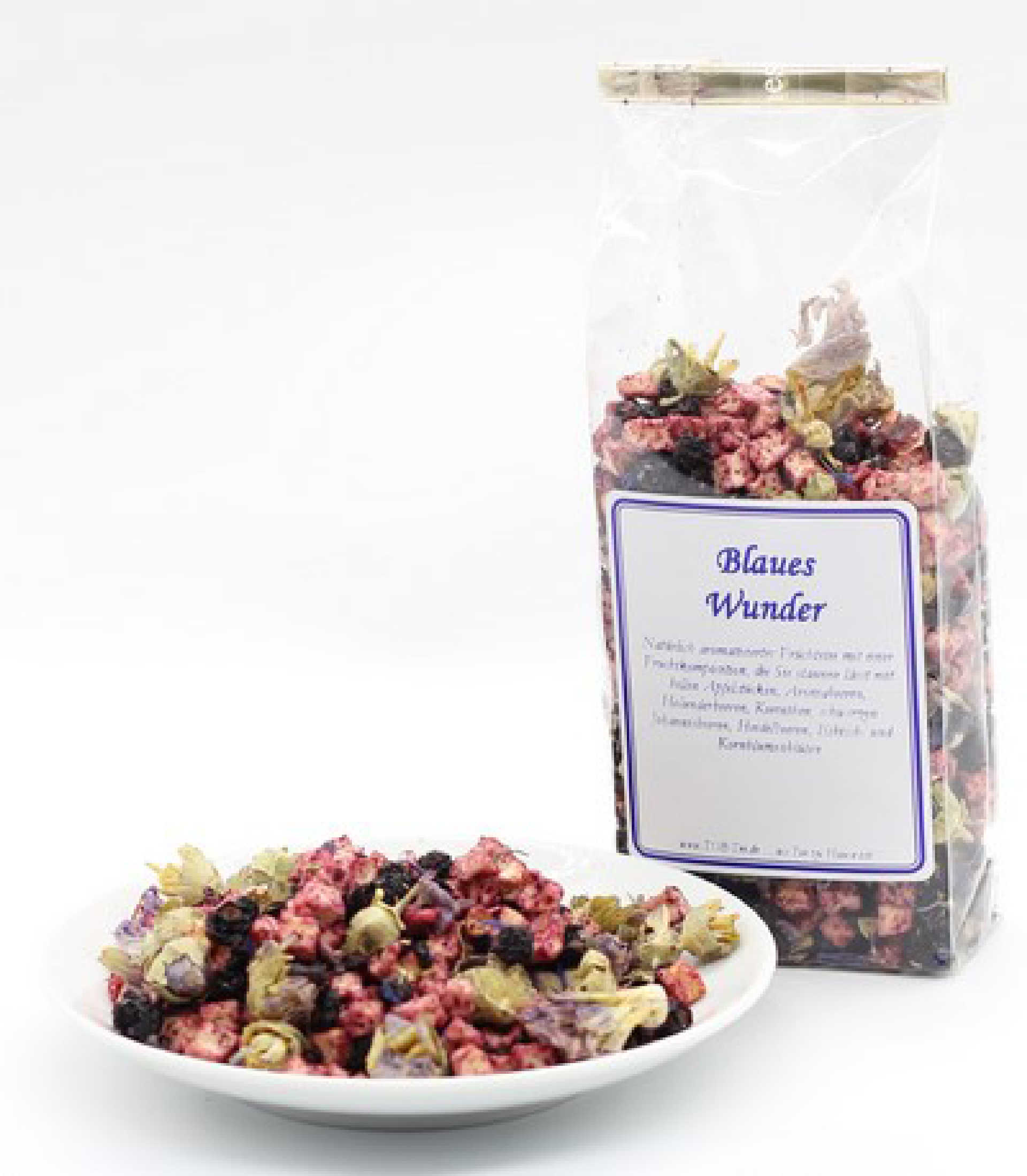 Natürlich aromatisierter Früchtetee mit einer Fruchtkomposition, die Sie staunen lässt mit hellen Apfelstücken, Aroniabeeren, Holunderbeeren, Korinthen, schwarzen Johannisbeeren, Heidelbeeren, Eibisch- und Kornblumenblüten