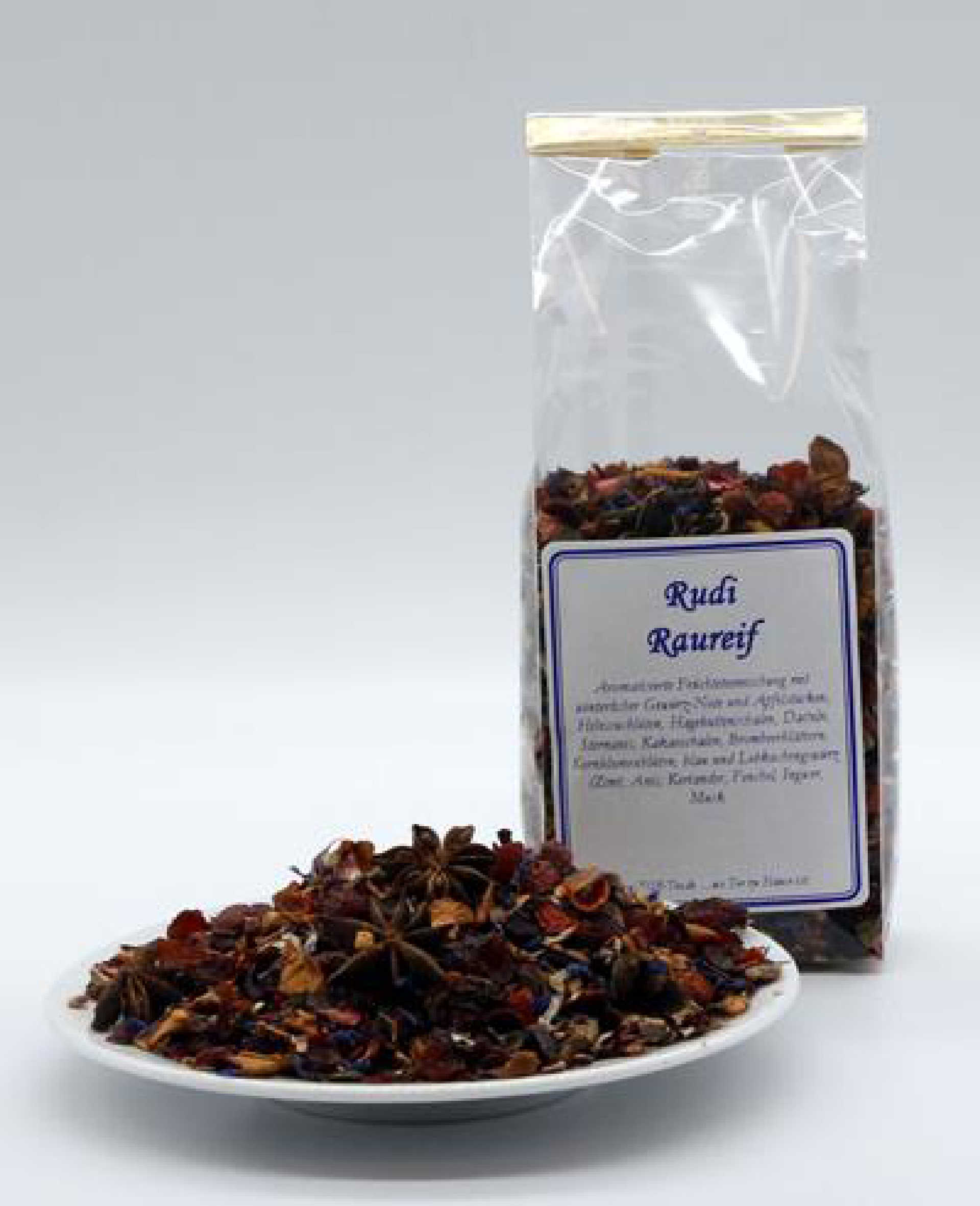 Aromatisierte Früchteteemischung mit winterlicher Gewürz-Note und Apfelstücken, Hibiscusblüten, Hagebuttenschalen, Datteln, Sternanis, Kakaoschalen, Brombeerblättern, Kornblumenblüten, blau und Lebkuchengewürz (Zimt, Anis, Koriander, Fenchel, Ingwer, Muskat, Nelken, Sternanis)