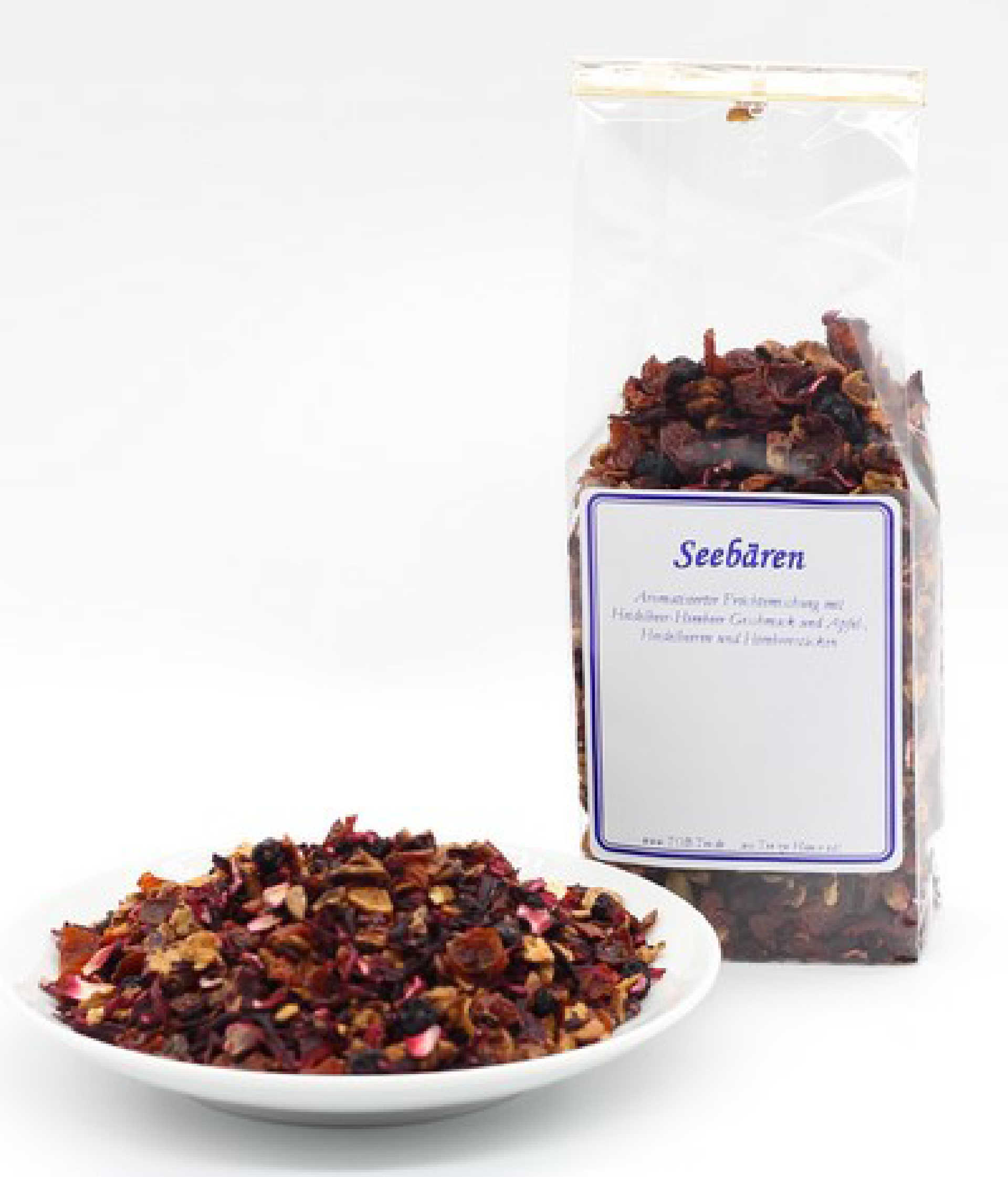 Aromatisierter Früchtemischung (Hibiscus, Hagebutte und Apfel) mit Heidelbeer-Himbeer Geschmack und Apfel-, Heidelbeeren und Himbeerstücken