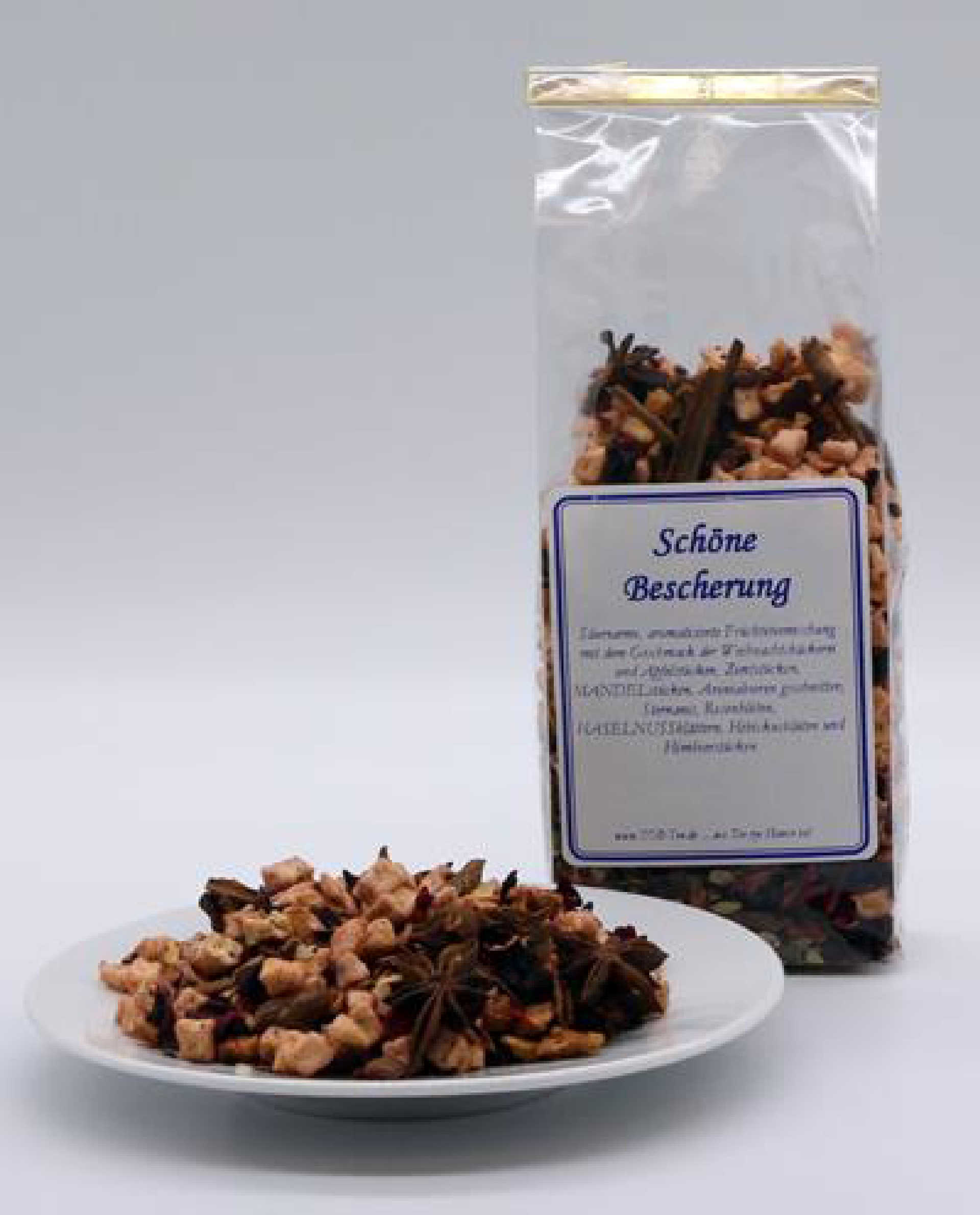 Säurearme, aromatisierte Früchteteemischung mit dem Geschmack der Weihnachtsbäckerei und Apfelstücken, Zimtstücken, MANDELstücken, Aroniabeeren geschnitten, Sternanis, Rosenblüten, HASELNUSSblättern, Hibiskusblüten und Himbeerstücken