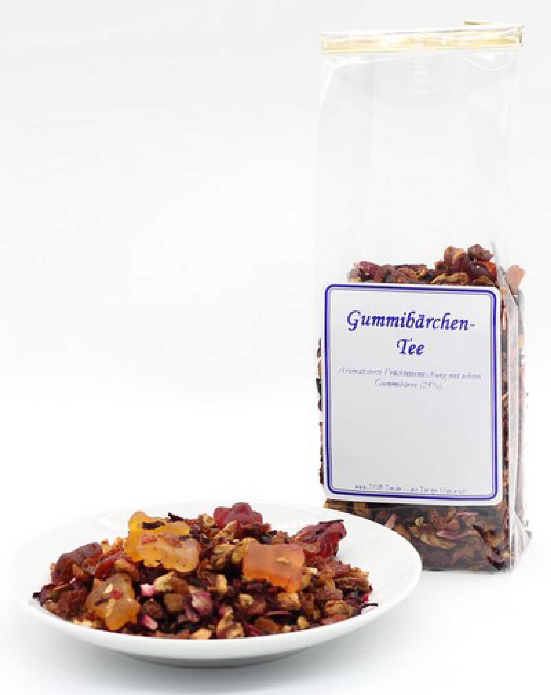 Aromatisierte Früchteteemischung (Hibiscus, Hagebutte und Apfel) mit echten Gummibären.