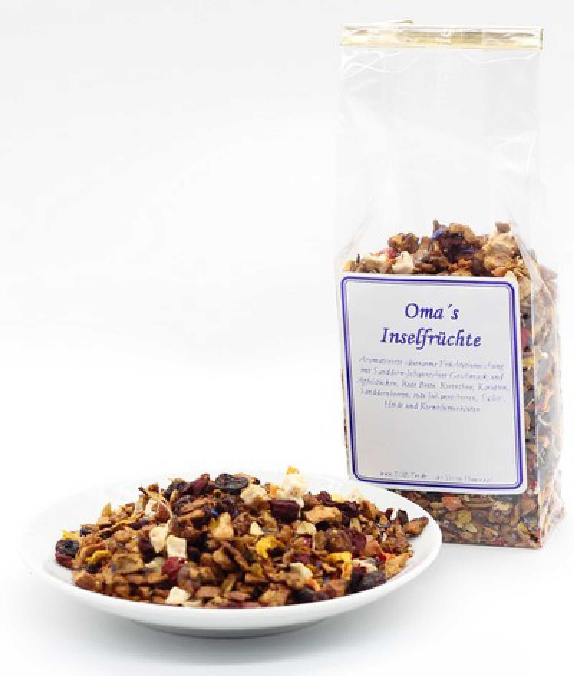 Aromatisierte säurearme Früchteteemischung mit Sanddorn-Johannisbeer Geschmack und Apfelstücken, Rote Beete, Korinthen, Karotten, Sanddornbeeren, rote Johannisbeeren, Saflor-, Heide und Kornblumenblüten