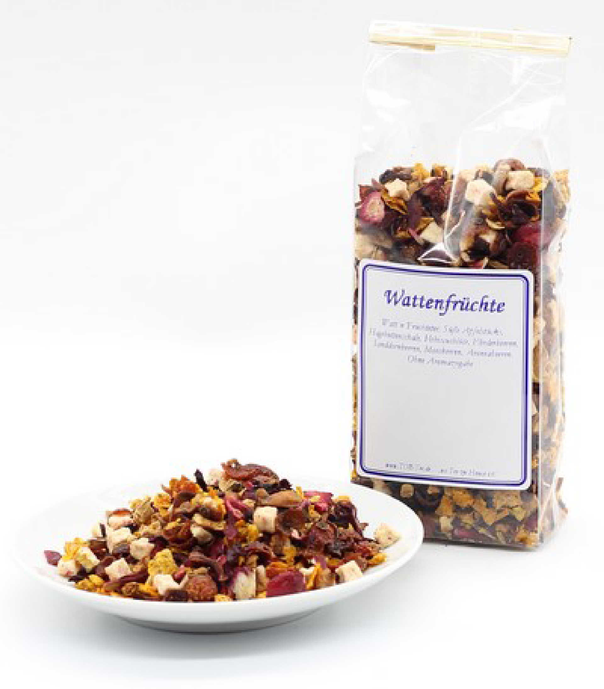 Watt´n´Früchtetee: Süße Apfelstücke, Hagebuttenschale, Hibiscusblüte, Fliederbeeren, Sanddornbeeren, Moosbeeren, Aroniabeeren. Ohne Aromazugabe