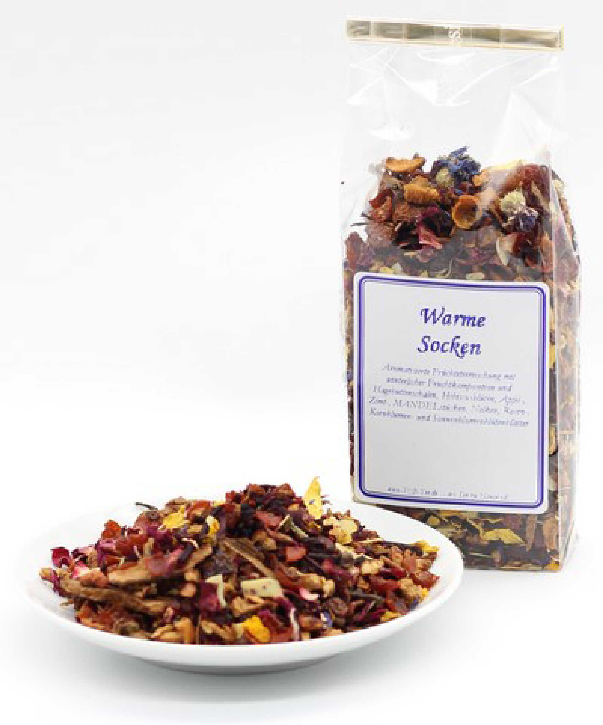 Aromatisierte Früchteteemischung mit winterlicher Fruchtkomposition und Hagebuttenschalen, Hibiscusblüten, Apfel-, Zimt-, MANDELstücken, Nelken, Rosen-, Kornblumen- und Sonnenblumenblütenblätter