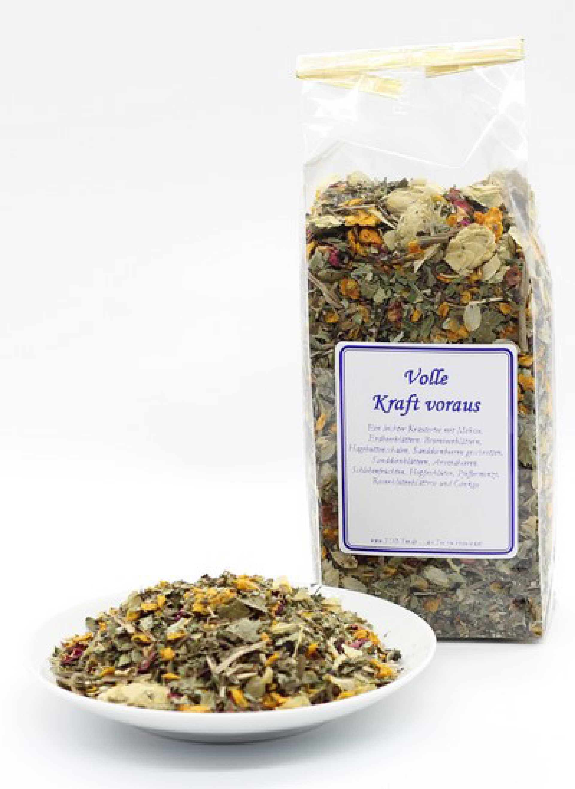 Ein leichter Kräutertee mit Melisse, Erdbeerblättern, Brombeerblättern, Hagebuttenschalen, Sanddornbeeren geschnitten, Sanddornblättern, Aroniabeeren, Schlehenfrüchten, Hopfenblüten, Pfefferminze, Rosenblütenblättern und Ginkgo