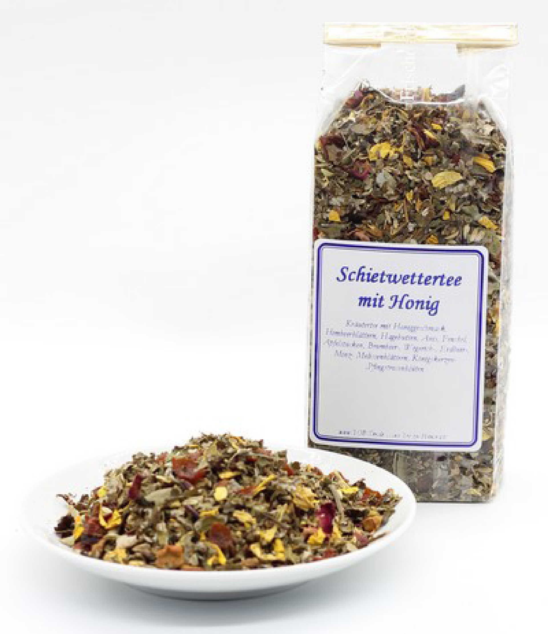 Kräutertee mit Honiggeschmack, Himbeerblättern, Hagebutten, Anis, Fenchel, Apfelstücken, Brombeer-, Wegerich-, Erdbeer-, Minz- Melissenblättern, Königskerzen-,Pfingstrosenblüten, Aroma