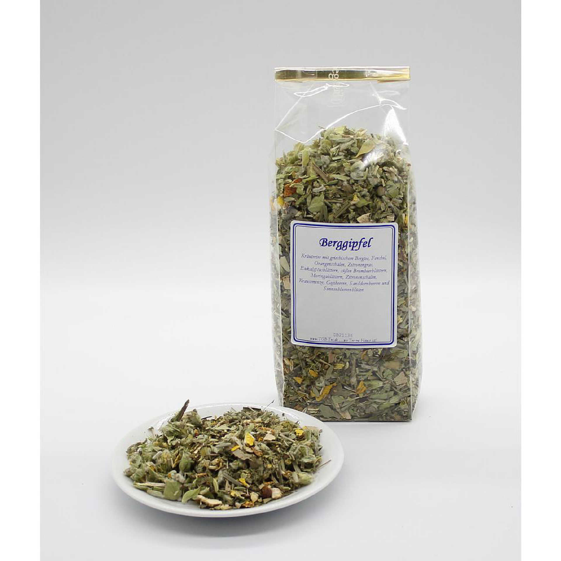 Kräutertee mit griechischem Bergtee, Fenchel, Orangenschalen, Zitronengras, Eukalyptusblättern, süßen Brombeerblättern, Moringablättern, Zitronenschalen, Krauseminze, Gojibeeren, Sanddornbeeren und Sonnenblumenblüten