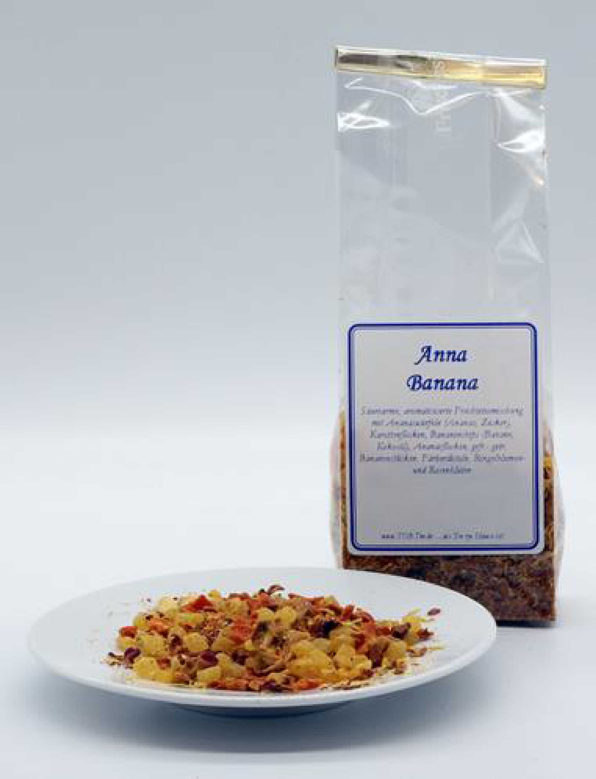 Säurearme, aromatisiserte Früchteteemischung mit Ananaswürfeln (Ananas, Zucker), Karottenflocken, Bananenchips (Banane, Kokosöl), Ananasflocken, gefr.- getr. Bananenstücken, Färberdisteln, Ringelblumen- und Rosenblüten
