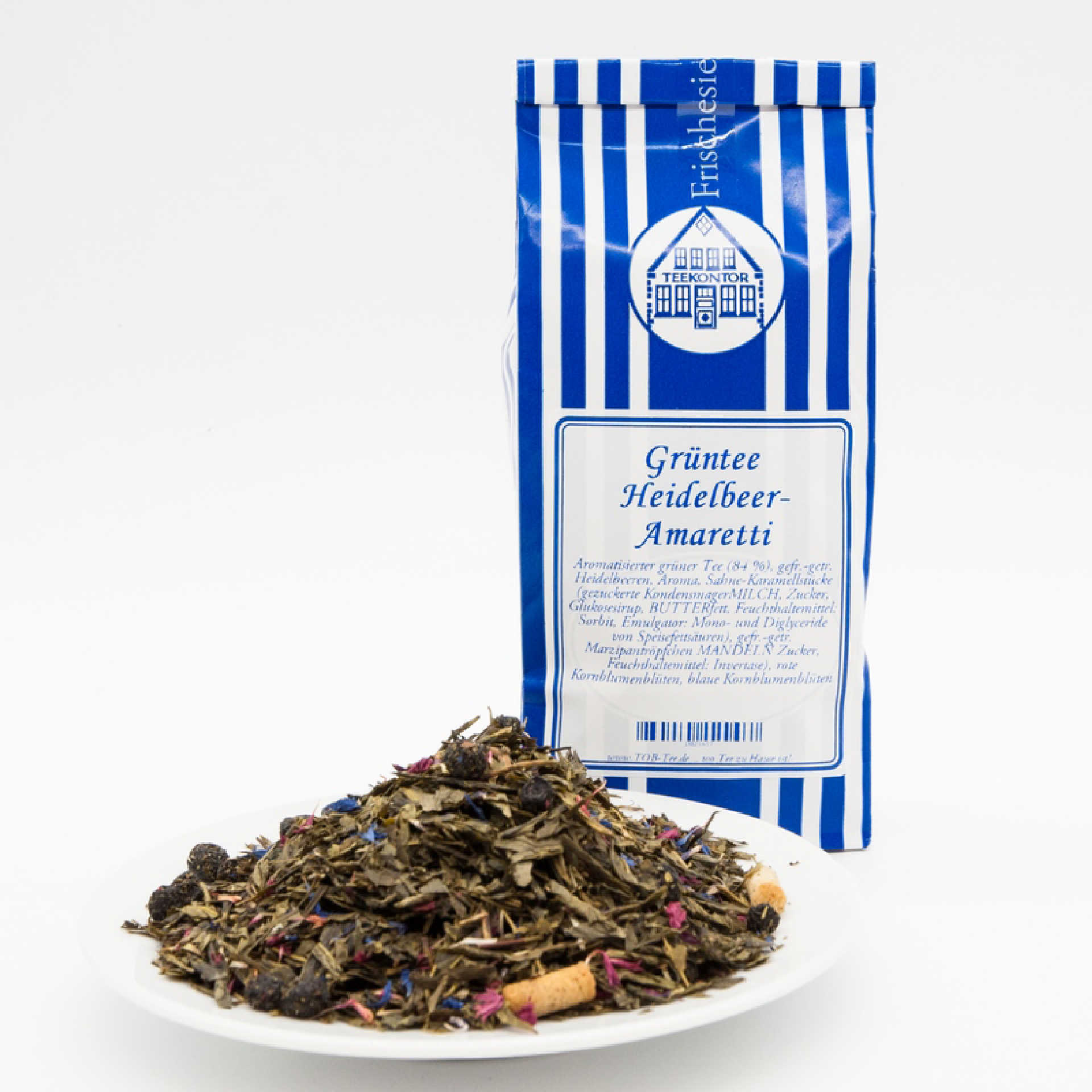 Aromatisierter grüner Tee (84 %), gefr.-getr. Heidelbeeren, Aroma, Sahne-Karamellstücke (gezuckerte KondensmagerMILCH, Zucker, Glukosesirup, BUTTERfett, Feuchthaltemittel: Sorbit, Emulgator: Mono- und Diglyceride von Speisefettsäuren), gefr.-getr. Marzipantröpfchen MANDELN Zucker, Feuchthaltemittel: Invertase), rote Kornblumenblüten, blaue Kornblumenblüten