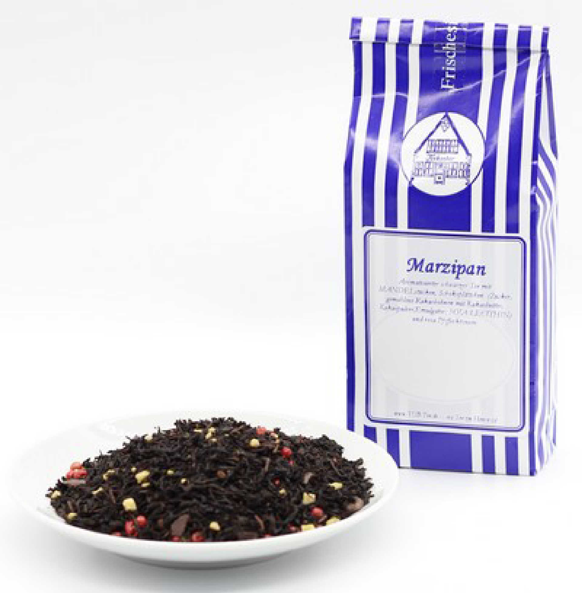 Aromatisierter schwarzer Tee mit MANDELstücken, Schokoplättchen (Zucker, gemahlene Kakaobohnen mit Kakaobutter, Kakaopulver,Emulgator: SOJA-LECITHIN) und rosa Pfefferkörnern