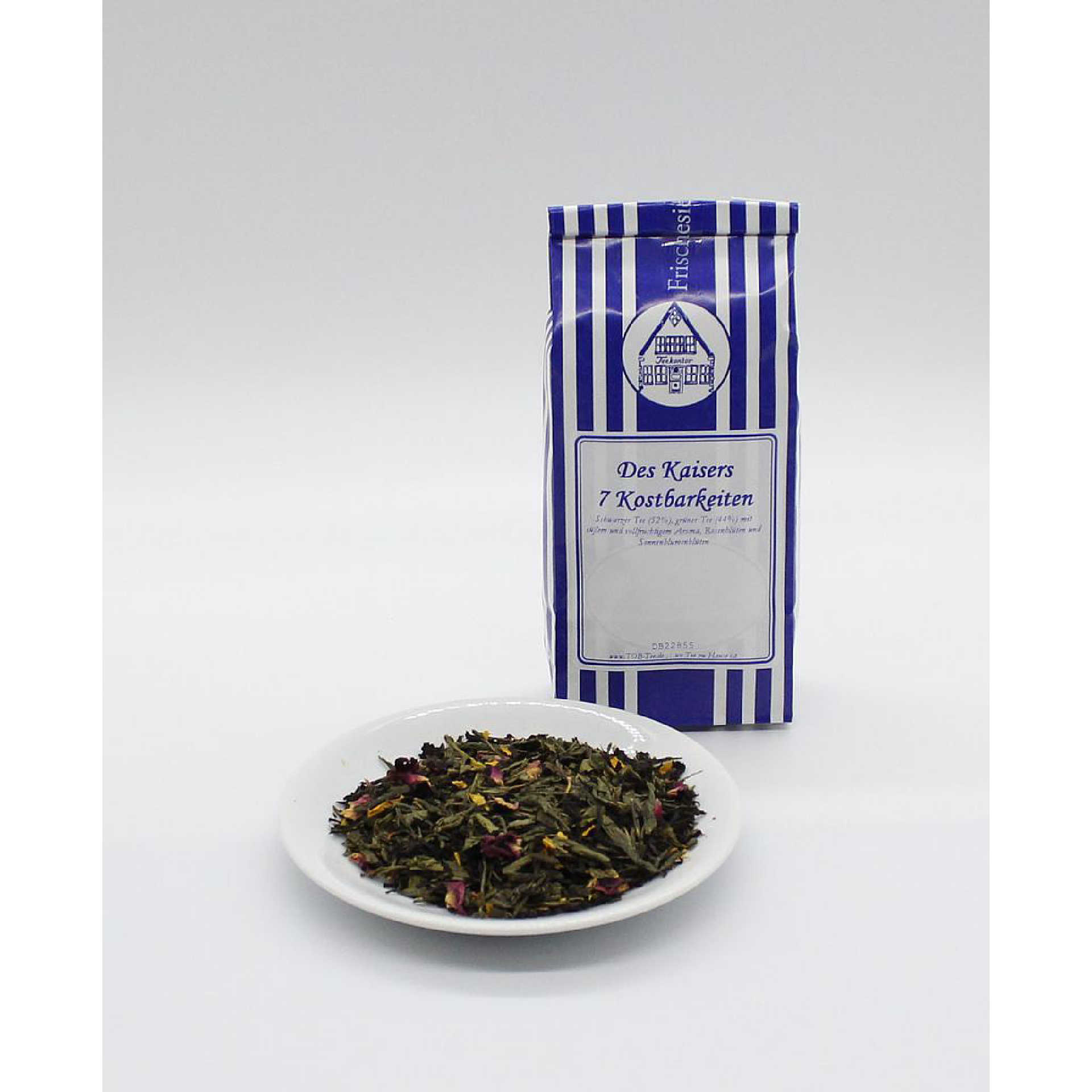 Schwarzer Tee (52%), grüner Tee (44%) mit süßem und vollfruchtigem Aroma, Rosenblüten und Sonnenblumenblüten