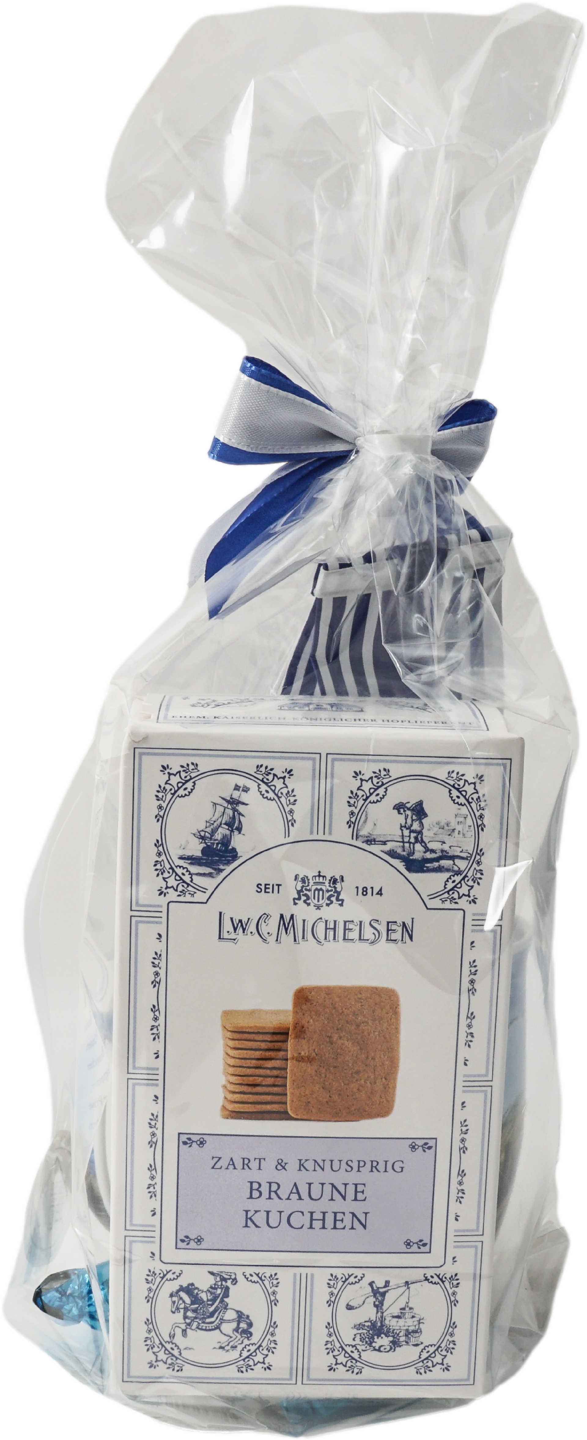 Teebecher „Nordsee“ mit 50 g Ostfriesische Mischung, „Friesische Braune Kuchen“, fünf Teebonbons